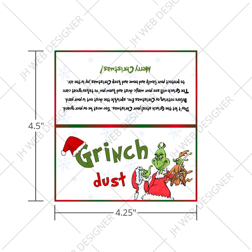 Grinch dust label design to go with your bags of Magic Grinch Dust. Includes Grinch poem on the back of the label. You get 2 labels on 1 sheet of standard size paper 8.5 x 11 inches.